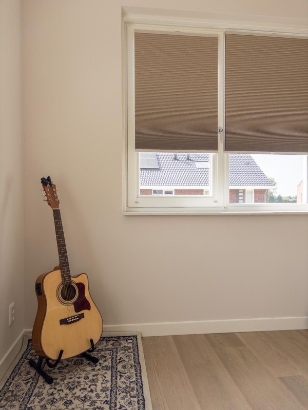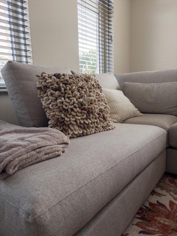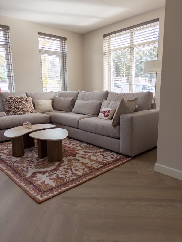 In de woonkamer is gekozen voor natuurlijke kleuren die mooi samengaan met het lichte hout en de zachte stoffen van de meubels. De royale hoekbank, warme accessoires en het kleed met subtiel patroon zorgen voor een sfeervol geheel. De basis van de ruimte is neutraal, waardoor de bewoners met kussens en decoratie eenvoudig accenten kunnen toevoegen.