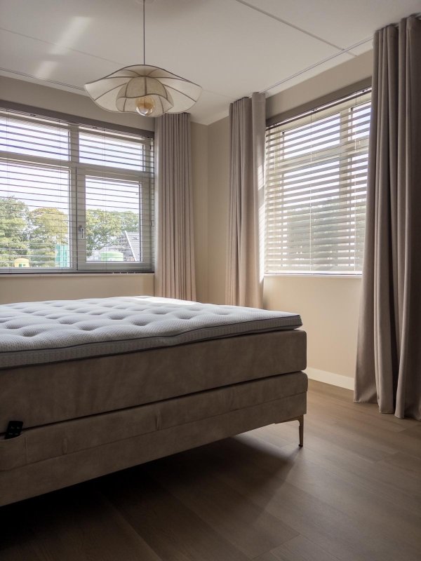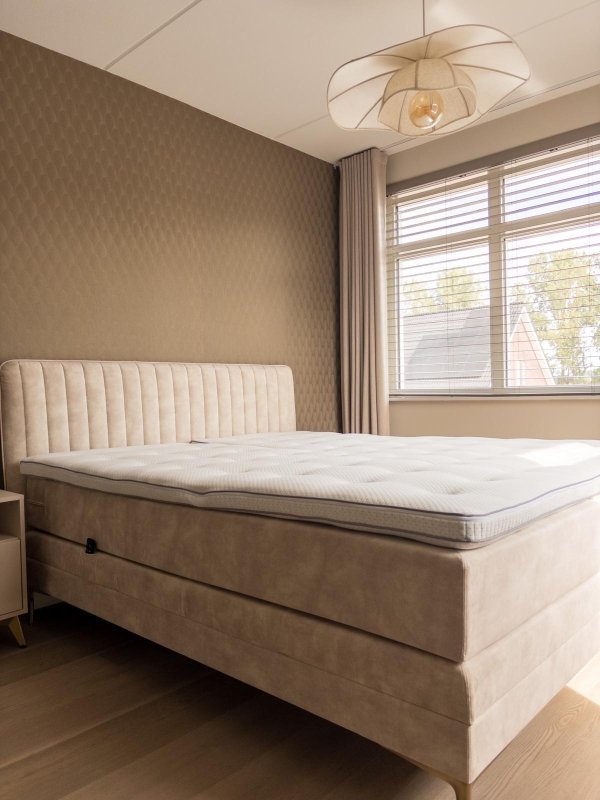 Ook in de eethoek en slaapkamer loopt deze stijl door. Bij de eettafel geven de moderne stoelen en de bijzondere lampen boven de tafel de ruimte een stijlvol karakter. In de slaapkamer is gekozen voor een luxe uitstraling met een rustige wandbekleding in zachte tinten. Het behang met subtiel patroon vormt een elegante achtergrond bij het comfortabele bed en maakt de kamer compleet.